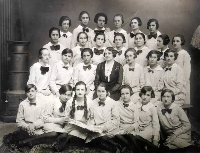 Az Unirea leánygimnáziumban készült a kép úgy 1925--1927 körül. Középen a némettanárnő van, ő magyar nő volt, Máriának hívták. Én a második sorban vagyok, jobbról a második. A negyedik sorban jobbról az első Szántó Vicu, akivel együtt szerepeltem előadásokon. Vicu nagyon jó, kedves leányka volt. Szántónak, a zsidó ügyvédnek volt az unokahúga. Nem marosvásárhelyi, hanem valahonnan faluról való volt, a rokonainál lakott a Jókai utcában.