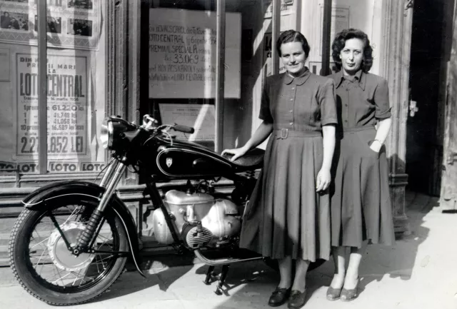 1956. március huszonharmadikán készült a kép. A főtéri lottóüzlet előtt csináltuk a képet, hogy lássa mindenki. Mellettem ez egy székelykáli fehérnép, Vas Ilonának hívták, együtt lottóztunk. Ez az asszony jött mindig takarítani, és mindig hozott valami tojást, ezt-azt. Ő vitt bele a lottózásba. Mondtuk, hogy nem adunk annyi pénzt érte, ezerhétszáz lej volt, de aztán négyen vettük meg a lottót: András öcsém felesége és az anyósa is társult. Ezt a német motorbiciklit nyertük. Romániában ez volt a legelső tárgynyeremény a lottón, addig csak pénzt kaptak. Ugyanabban az évben még nyertem a lottón kilencszáz lejt s egyszer négyszáz vagy négyszázötven lejt.
