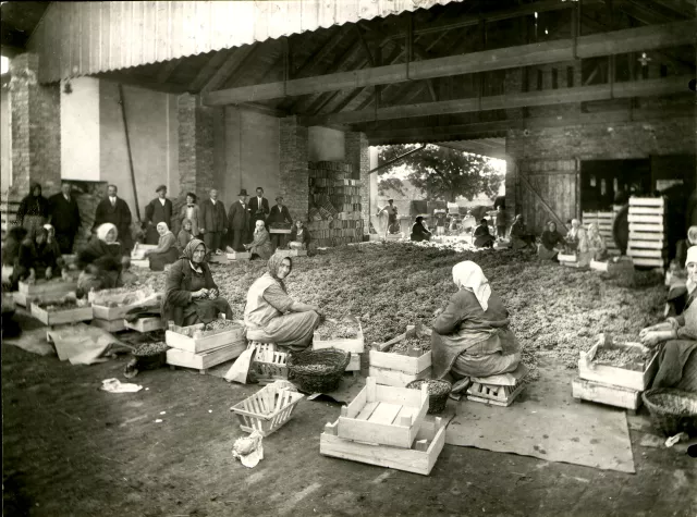 Ez a nagykőrösi házunk képe. A kép bármikor készülhetett az 1930-as években. Itt volt a bejárat, az udvar, itt volt egy raktárféle, és itt volt a ház. A raktár alatt volt egy pince, ott elég sok hordó volt. A fal előtt ott áll az édesapám, Rosenfeld Sándor kalapban. Más ismerős nincsen, úgy nézem. Itt a csomagoló asszonyok látszanak, akik válogatják és csomagolják a gyümölcsöt.