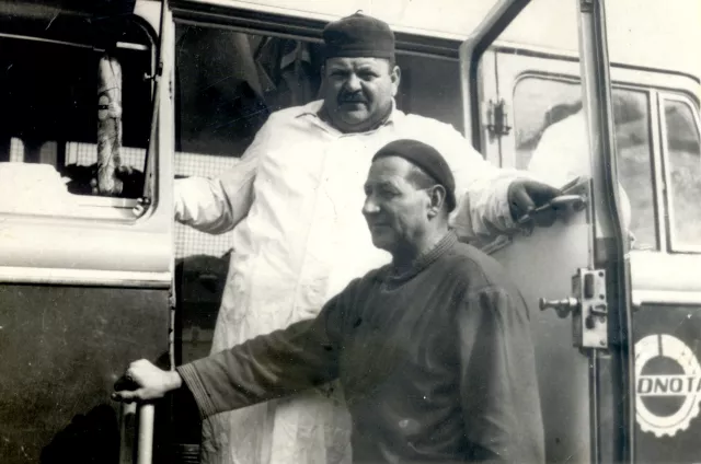 A mozgó hentesüzlet tulajdonképpen egy autó volt, amellyel a Jednota hordta szét a húsféleségeket az olyan falukba, ahol nem volt hentesüzlet. A képen, melyet a Jednota fényképésze készített 1958-ban, a férjem látható a sofőrrel, akit Molnárnak hívtak.