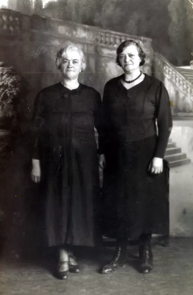 A felvételen apósom két lánytestvére látható. A bal oldali hölgy született Adler Gizella. A jobb oldali hölgy pedig Adler Etelka. Pesten éltek. A háború előtt nagyon keveset voltak együtt a nádszegi családdal, ha el is jöttek Nádszegre, csak egy-két napig maradtak ott. A férjük vezetéknevét sajnos nem ismerem. Amikor mi összekerültünk, akkor már nem éltek. Pesten laktak. Nem ismertem őket.