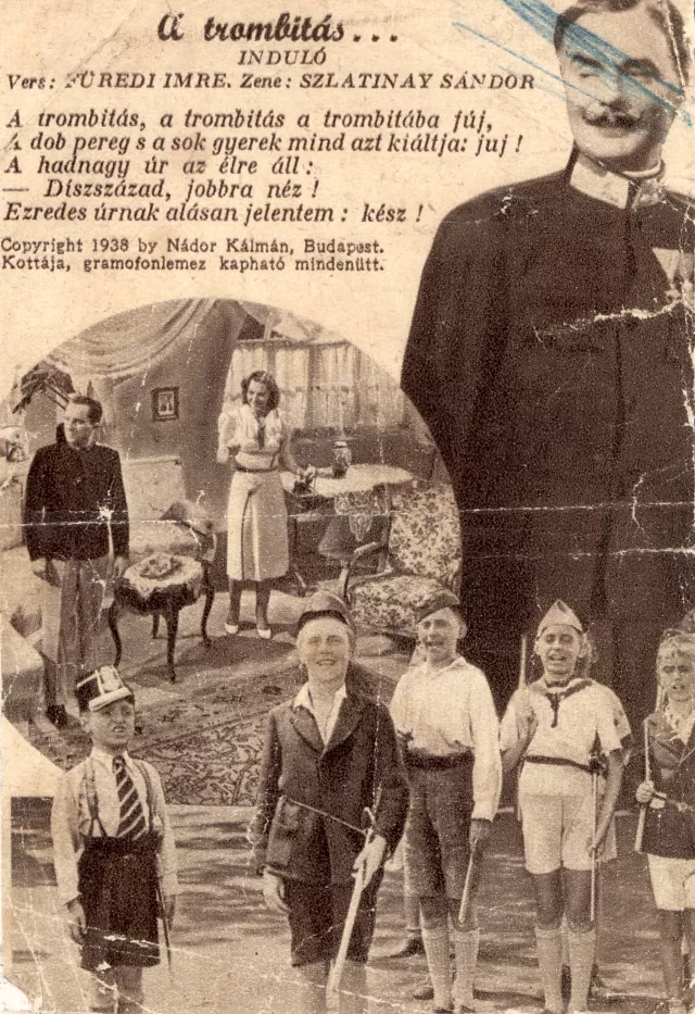 Ez a 'Beszállásolás' című film plakátja. A filmet 1938-ban forgattuk. Szlatinay Károly rendezte [Szlatinay Sándor volt a rendező. -- A szerk.], és olyan hírességek játszottak benne, mint Bilicsi Tivadar, Kabos Gyula, Páger Antal és Kiss Manyi. Én egy kis katonagyereket játszottam benne. Ezen a plakáton is rajta vagyok, a gyerekek között, a bal szélen. Nagyon szerettem filmezni. Ez után a film után ajánlotta fel Kabos Gyula a nagymamámnak, hogy kivisz magával Hollywoodba, mert annyira tehetségesnek tart. A nagymama persze nem egyezett bele, így maradtam itthon. Néha belegondolok, hogy mi lett volna, ha... Kabos ekkor ki is ment, és kint maradt a haláláig, 1941-ig.