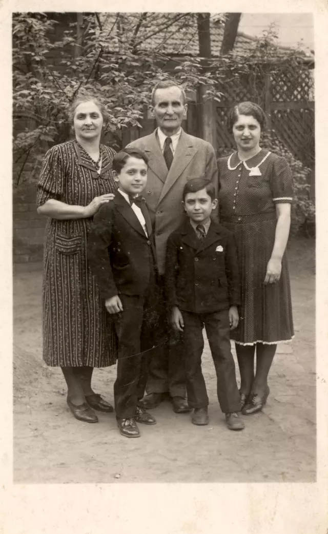 Ez a kép valahol Budapesten készült, 1939-ben. Rajta van az egész családom. Bal oldalon áll a nagyanyám [Schultheisz Kálmánné, szül. Weiner Róza], mellette a nagyapám [Schultheisz Kálmán], mellettük az édesanyám [Angyalosi Béláné, szül. Schultheisz Etel]. Elöl állunk mi, az öcsémmel [Angyalosi László], balról én, jobbról Kislaci, ahogy a családban hívtuk, mivel a nagybátyámat is Lacinak hívták. Nem emlékszem, hogy milyen alkalomból készült, mindenesetre szépen ki vagyunk öltözve.
