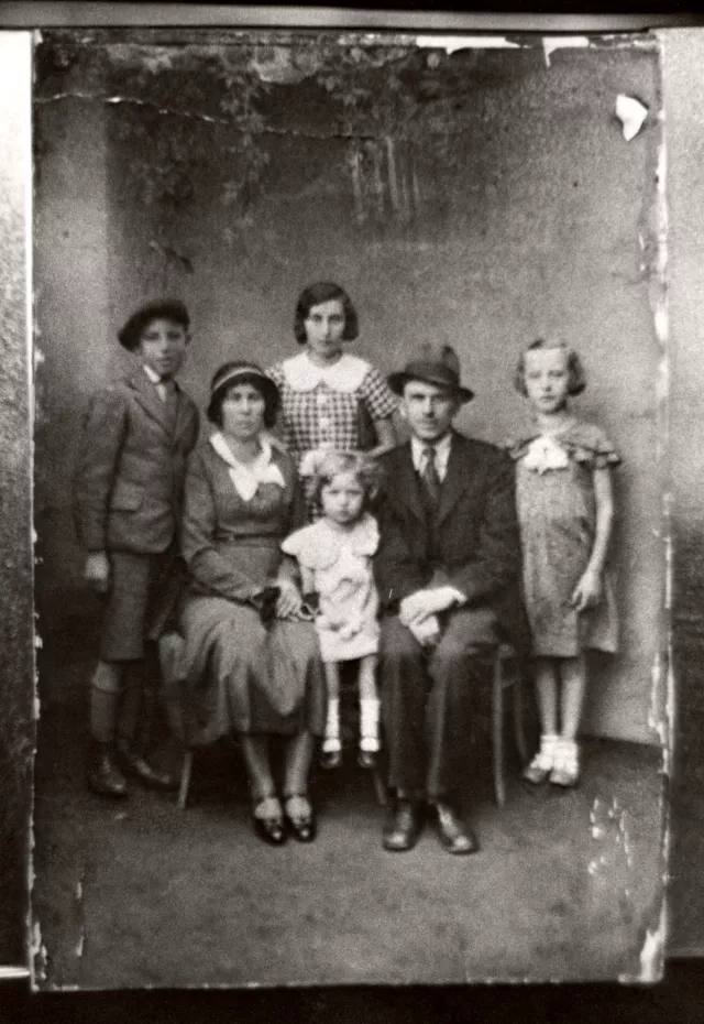 A kép 1932-ben készült, Késmárkon. Balról jobbra: [Pollák] Dezső bátyám, anyám, [Pollák] Rózsi nővérem, apám, [Pollák] Aranka nővérem. Középen ülök én.