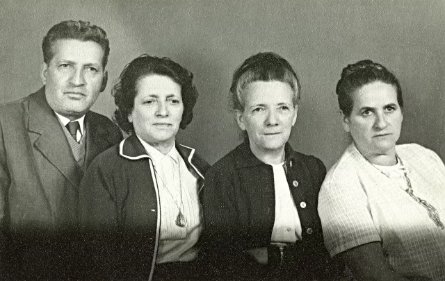 Ez a kép 1965-ben készült, és apámnak a háború után életben maradt négy testvérét ábrázolja. Jobbról balra: Margit nagynéném (Manyóka, a libás,), Hédi nagynéném, aki a legidősebb és a leggazdagabb volt, Erzsi nagynéném, akit Örzsinek hívtunk, aki a Frigyes unokabátyámnak az édesanyja, és Pali nagybátyám.
