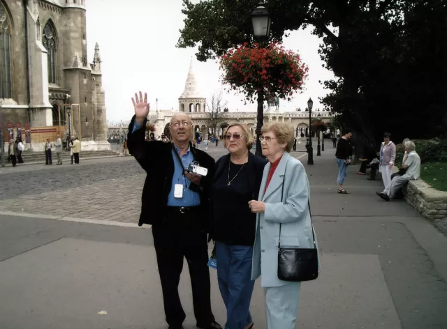 Ezen a képen az unokatestvérem, Drucker Ernő (Ezra) és a felesége, Dvora látható. Mellettük a jobb oldalon a feleségem áll [Drucker Tiborné, szül. Varga Katalin]. Ernő a háború után két évvel került Izraelbe [akkor még: Palesztina]. De rendszeresen jön Magyarországra. Ez a kép a Mátyás templomnál készült.