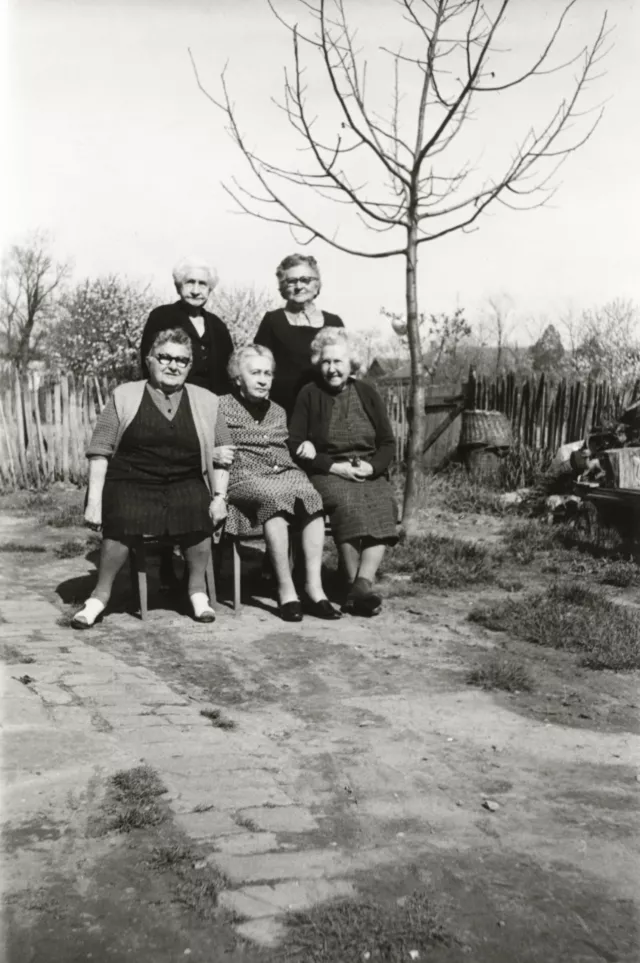 A kép az édesanyám nyolcvanadik születésnapján készült az öreg ház kertjében. Ülő sorban balról: Révész Endréné (Boros Júlia), Engelsmann Jánosné (Boros Katalin), Stark Sándorné (Boros Erzsébet). Áll balról jobbra: T. Nándorné (Boros Lenke) Varga Zoltánné (Boros Piroska). Lenke volt a legidősebb, nyolcvanhét éves korában, 1983-ban halt meg. Piroska volt a legfiatalabb, ő kilencvenegy éves korában, 2002-ben halt meg. Júlia nyolcvanegy éves korában, 1983-ban halt meg; Katalin, a mamám nyolcvanéves korában, 1977-ben halt meg. Erzsébet nyolcvanhárom éves korában, 1983-ban halt meg. Mindnyájan Szegeden haltak meg, ott is vannak eltemetve a zsidó temetőben. Hárman tehát ugyanabban az évben haltak meg. Mind az öt testvért Szegedről vitték el Bécsbe, és a családdal együtt élték túl a deportálást.
