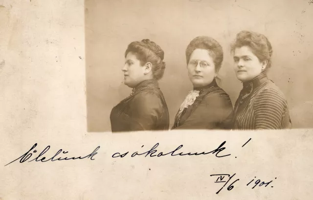 A kép jobb oldalán anyai nagymamám, Schischa Ignácné, szül. Österreicher Regina, mellette húgai, Berta és Natália. A lapot fivérüknek, Adolfnak küldték 1901-ben Zalaegerszegről Debrecenbe, aki ott vasutas volt. Ő volt az a családból, aki magyarosította a nevét Országra. Még egy fiútestvérük volt, Samu, aki építész volt.