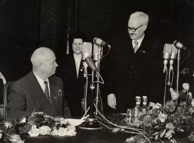 A kép 1958. április negyedikén készült, Budapesten. Bal oldalon Hruscsov, az SZKP főtitkára, jobb oldalon doktor Rusznyák István, az MTA elnöke, hátul Baik Éva.