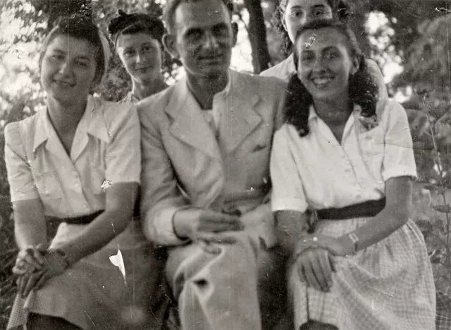 Ez egy baráti társaság, akikkel sokat kirándultunk. A képet is valaki a társaságból készíthette. Nálunk, a varrodában dolgoztak legtöbben. Család volt mindig, akik nálunk dolgoztak. Mindig változott a létszám, mert a tanulólányok két évig voltak, aztán úgy mondták, hogy fölszabadultak, segédek lettek, volt, aki elment, aztán másik jött megint, úgyhogy nem is tudom tényleg, hányan fordultak meg így nálunk. Egyszerre két segéd és két tanulólány dolgozott édesanyámnak, de összességében többen voltak. Egy-egy alkalommal elmentük együtt kirándulni vagy strandra, például Harkányba. S ezzel a társasággal megmaradt a kapcsolat valamennyire. Mikor a deportálásból hazajöttem, akkor is találkoztam velük. A legtöbben keresztények voltak.