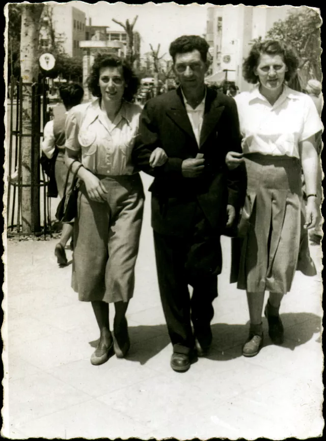 Ezen a képen én vagyok még mint Lőb Dóra, a nővérem, Rella, azaz Bars Sándorné és a férje társaságában. A kép az esküvőm napján készült Tel-Avivban 1950-ben. Arra is emlékszem, hogy éppen függönyanyagot mentünk venni így hármasban. Ez azért volt nagyon nagy dolog, mert a férjem annyira jól keresett ebben az időben, hogy már saját lakása volt. Amikor elhatároztuk, hogy össze fogunk házasodni, akkor már megvolt a lakása. Igazi agglegénylakás volt, én pedig nagyon szívesen szépítgettem.