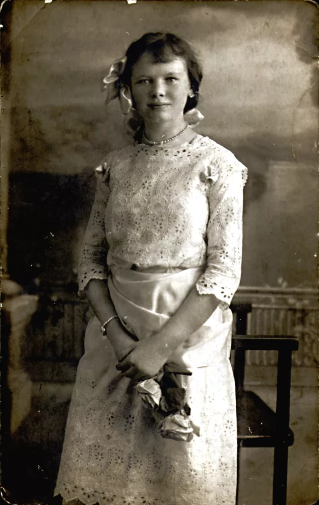 Ez a Neuwelt Aranka nevű rokonom. Lehet, hogy ez az esküvői képe, mert fehérben van, és valami van a kezében. Ő elég későn ment férjhez, szerintem ő lehetett olyan 32-33, amikor férjhez ment. Amikor én Pestre kerültem 1938-ban, ő akkor már férjnél volt.