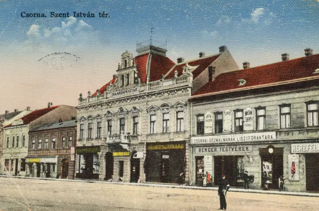 A kép jobb szélén a Berger család háza. A földszint nagyobbik részén a Berger Testvérek (Berger Náthán és Berger Lipót) üzlete volt, mellette egy órásmester. Én erre az órásra már nem emlékszem, hanem arra, amikor itt Zollner Jenő rádióüzlete volt. Mellette Herzfeld textilüzlete. Őt követte időben Friedmann, szintén textiles volt. Ez a kép az 1910-es években készülhetett.