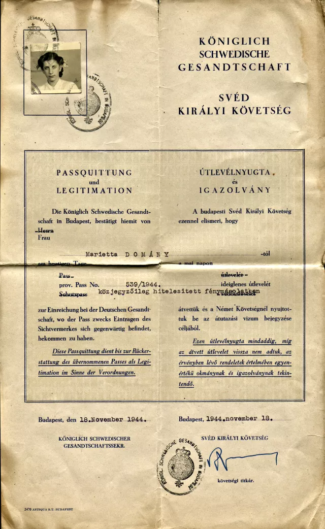 Ez az igazolásom és útlevélnyugtám, amit a Svéd Királyi Követség állított ki 1944. november 18-án.