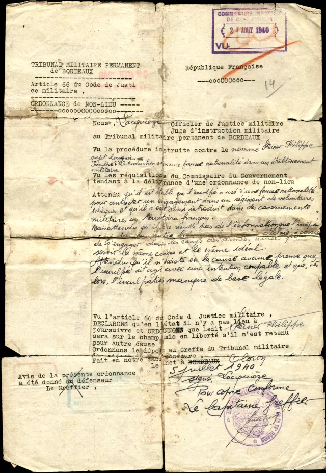 Ez egy bírósági jegyzőkönyv, hogy a vád alól, miszerint én hamis adatokkal férkőztem be a cseh légióba, felmentenek. Non lieux -- ez a kifejezés szerepel rajta, ami azt jelenti, hogy okafogyottá vált a vád. Le van rajta írva kézírással, hogy mi volt pontosan a vád ellenem, ez már elég nehezen olvasható, és utána le van írva egy ilyen szokásos, bírósági szöveggel, hogy felmentenek. A történet pedig így volt: