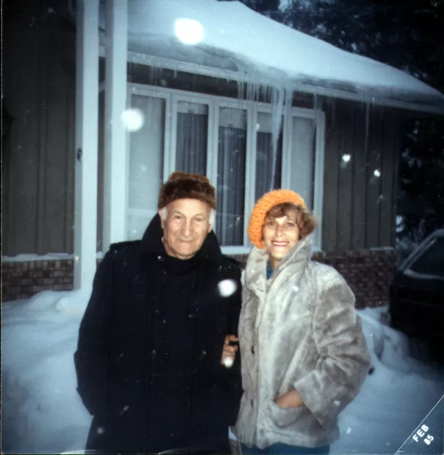 Ezen a képen én vagyok a férjemmel, Blum Lacival. A kép Clevelandben készült az utolsó alkalommal, amikor ott jártunk. Ebben a házban laktunk. Ilyen kemény telek voltak ott, amit azért nem volt annyira egyszerű megszoknunk az izraeli klíma után. Leginkább a gyerekeinknek volt nagy szám a hó, hiszen ők Izraelben születtek, és nem is láttak még havat.