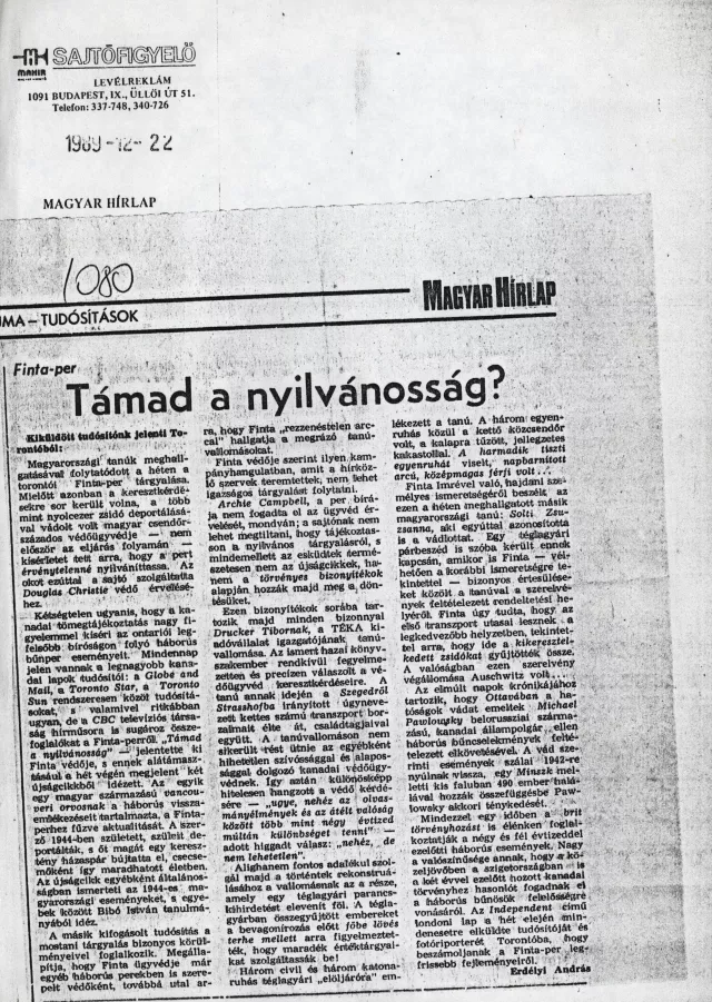 A "Magyar Hírlap" 1989-ben tudósított az úgynevezett Finta-perről, ahol én koronatanú voltam.