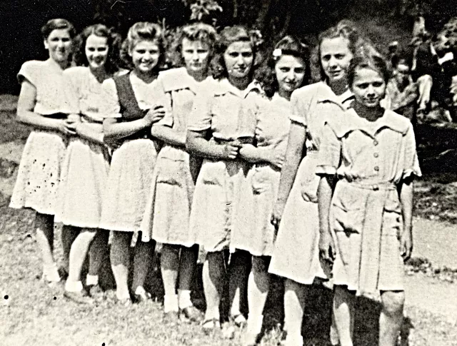 Ez a kép 1946-ban készült a Schuller-gyárban, ahol dolgoztam. A libasorban én vagyok jobbról a harmadik. Előttem áll a mostohaanyám.
