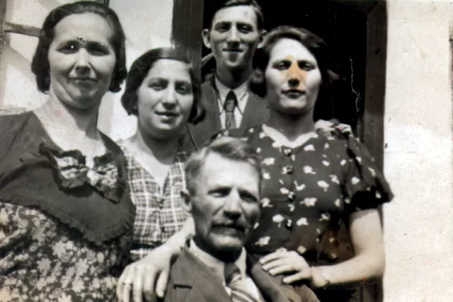 Itt én vagyok néhány rokonommal. Balról jobbra áll Helén, anyám sógornője, aztán a két nővérem, Juliska és Jolán. Hátul állok én, elöl az apám. A kép Putnokon készült 1934-ben.