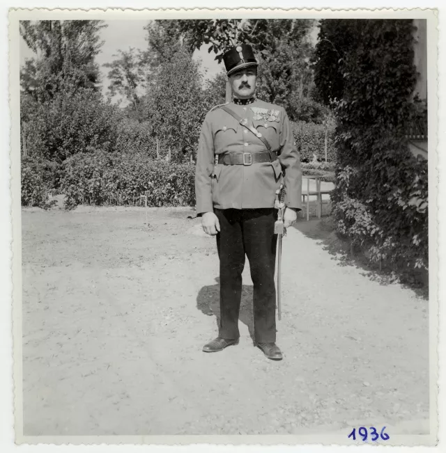 Apám a rákoscsabai nyaralónk kertjében honvédszázadosi díszegyenruhájában 1936-ban. A bátyám készítette a képet.