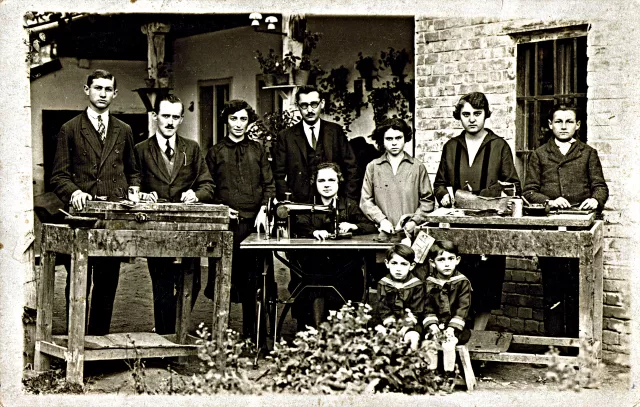 A képen a kiskőrösi lakóházunk és a cipőfelsőrész-készítő műhelyünk van. A középen álló szemüveges férfi az apám, mellette ül az anyám. A többi felnőtt alkalmazott volt a műhelyben. Elöl a két gyerek: baloldalt én, jobboldalt a testvérem, Zsuzska. Olyan négy és hat évesek lehettünk, tehát a kép 1927-ben készülhetett.