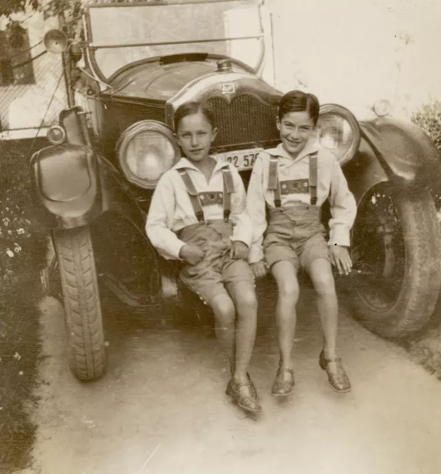 A kép 1932-ben készült, a fivéremmel ülünk apám autójának az elején a rákoscsabai nyarló kertjében.