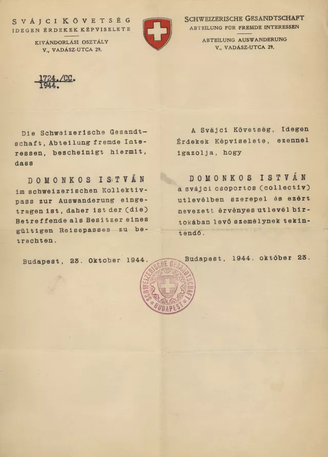 Domonkos István svájci menlevele: