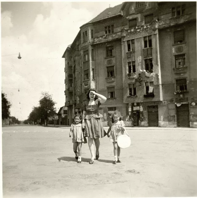 Ez én vagyok két unokahúgommal. Ez a Bulcsú utca 21/b. Itt laktunk 1944 tavaszától, mert ez akkor csillagos ház lett. Az első emeleten volt a lakásunk.