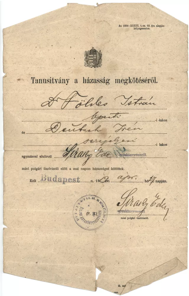Dr. Földes István és Deutsch Irén házassági tanúsítványa
