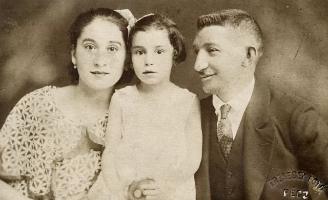 A kép körülbelül 1930-ban készült. Édesanyám, V-né R. Ilona, édesapám, V. Andor és én vagyunk rajta. Édesapám itt harmincnégy éves, anyukám olyan huszonöt lehet, én pedig öt éves vagyok. Ez a kép az Erzsébet Fotónál készült, a Király utcában. Valamelyik nagy kapu alatt volt a műterem, szemben a színházzal, de egy csöppet kijjebb. Nem tudom, milyen alkalomra készült a fénykép, talán csak úgy. Aki a fotót készítette, nagyon aranyos teremtés volt, nálam is erősebb testalkata volt. Erzsébetnek hívták, mosolygott mindig, olyan piros képű volt, fényképész volt, és nagyon barátságos. Ő is zsidó volt, és vissza is jött a háború után.