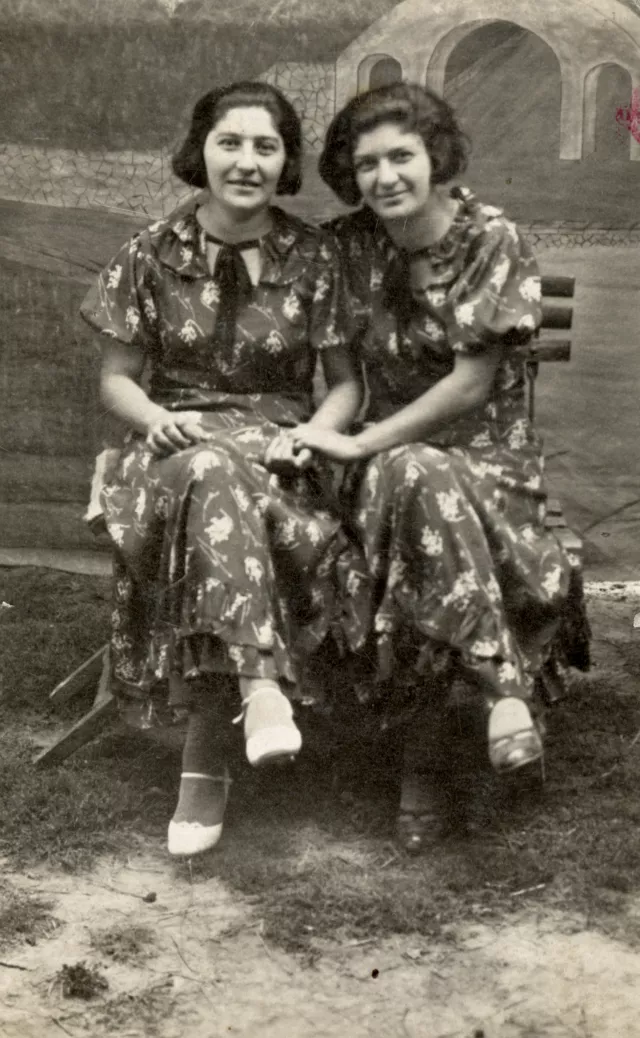 Ez édesapám két húga: V. Ilonka (bal oldalon) és V. Bözsi (jobb oldalon). Itt még lányok voltak, tizenhét-tizennyolc évesek így ránézésre. Pécsváradon készült a kép, úgy kaptam, valamikor az 1920-as években.