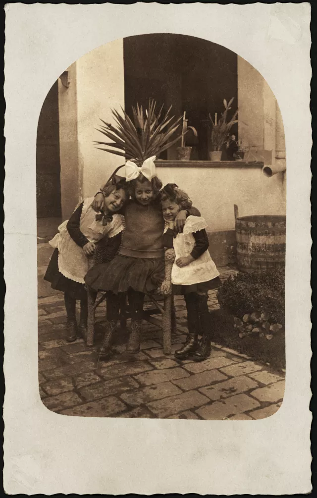 A képen nyolcéves vagyok. Én állok középen, jobbra a húgom, Lili, balra pedig az unokahúgom, Rózsi. A fénykép az indijai házunk udvarán készült. Jobbra mellettünk van az esővízgyűjtő dézsa, és balra volt a kút, egy nagyon mély, jó vizű kút, nyáron mindig ott hűtöttük a görögdinnyét.