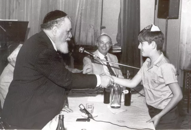Ez a fénykép a Talmud-Tóra versenyen készült, ami a Tóra és a zsidó hagyományok ismeretéről szóló verseny, a döntőn, ahol a fiam, Emil második helyezést ért el. A verseny Bukarestben volt 1982. szeptember tizenkettedikén és tizenharmadikán (5742. elul 24-25.). Doktor Moses Rosen főrabbi gratulál Emilnek.