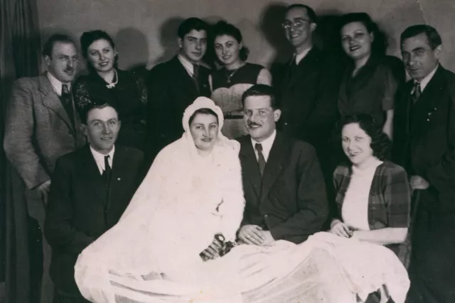 Ez szintén egy esküvői kép. A testvérem, Kati és a férje, Erdős Imre látható rajta. Balról az első vagyok én. Jobbról az első, a zöld kockás kosztümben a Holtzer Szilárd [Brandl Alexander sógora, Cecília nevű húgának a férje] nővére, aki később kivándorolt Ausztráliába. A többieket nem ismerem.