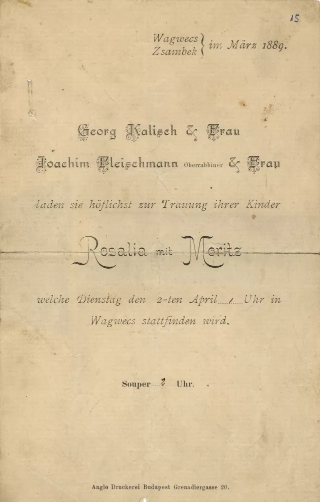 Apai nagyszüleim, Fleischmann Mór és Kalisch Rozália 1889. április 2-án kötöttek házasságot. Az esküvő Vágvecsén volt [Vágvecse (Nyitra vm.) -- kisközség, 1910-ben 1100 magyar és szlovák lakosa volt. Trianon után Csehszlovákiához került, 1993 óta Szlovákia -- A szerk.], ahol a dédapám, Kalisch György és családja élt. Hogy a nagyanyám mikor született, azt nem tudom, csak azt, hogy 1942-ben halt meg. A Fleischmann család ebben az időben Zsámbékon lakott [Zsámbék (Pest-Pilis-Solt-Kiskun vm.) -- nagyközség, 1920-ban 4300 német és magyar lakos -- A szerk.], ahol a másik dédapám, Fleischmann Joachim rabbiként működött. Mór Abonyban született 1858-ban [Abony -- a későbbi Pest-Pilis-Solt-Kiskun vm.-ben lévő nagyközség -- A szerk.], és még gyerek volt, amikor a család Zsámbékra költözött. A Kalisch Rozáliával kötött házassága a második volt, mert korábban feleségül vette Rosenberg Katit, akitől egy fia született, Miklós. Attól elvált, és Miklós az anyjával maradt. Aztán Miklós valamikor, nem tudom, mikor, Fleischmannról Mészárosra magyarosított. Semmi többet nem tudok apám féltestvéréről.