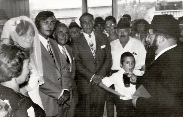 Ez a kép Izraelben Tel-Avivban készült. A menyasszony, testvéremnek (Krausz Irma) az unokája, Chava (Éva). Mi először 1966-ban mentünk ki először a Sárival. nővéremmel Ez itt pont a hüpe alatti áldás a borral. A hüpe a plafonon van szerelve és ezért nem látszik.