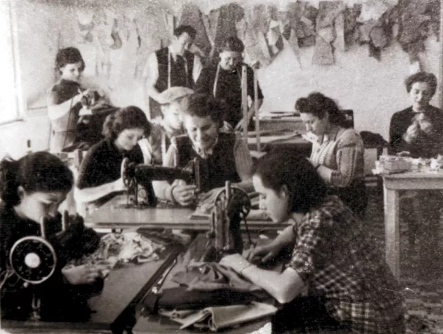 Ez volt a Szalon Ráhel műhelye, amit az anyukám testvére, Rózsi csinált Tel-Avivban. Én itt dolgoztam náluk, amikor kimentem Palesztinába. Hátul jobbra van a René, a Rózsi testvére, én pedig hátul ülök sapkában. A pajesz itt volt a sapka alatt bedugva. Én a szabást nem tanultam meg, csak megfigyeltem. De minden részét csináltam, a fércelést, a többi dolgot, mindent, amit ők is tanultak, a vasalást. 1940-ben készült a kép.