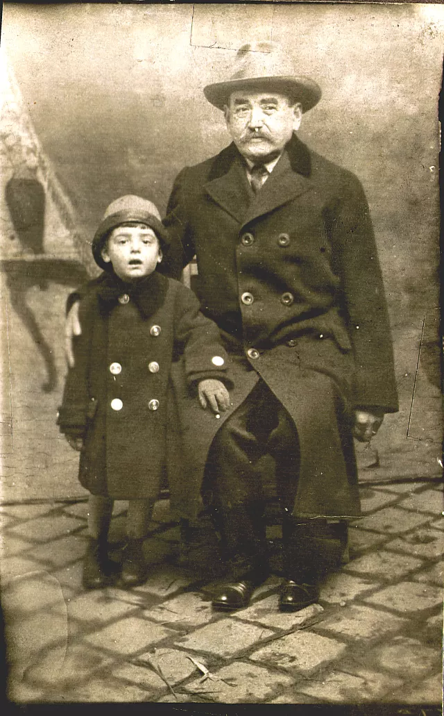 A nagyapa minden vasárnap vitte sétálni a bátyámat a Ligetbe. A bátyám itt olyan két éves, olyan 1926-ban készülhetett ez a fotó. A Ligetben volt egy régi fotós, úgy hívták, hogy Helfgott bácsi, aki mindig mondta, hogy 'most repül a kismadár'. És a bátyám itt, a kis pofa, eltátotta a száját, és várta a kismadarat a nagypapával. Hát ez olyan édes volt, úgy szeretem ezt a képet, olyan drága. [Nem tudni, hogy Helfgott Sámuelnek csak a Városligetben volt-e fényképészete, ahol ez a fénykép is készült, vagy Földi Pálné téved, és a fénykép Helfgott Sámuel III. kerületi, Zsigmond utcai studiójában készült. -- A szerk.]