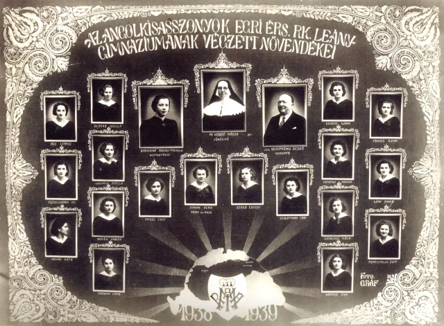 Érettségi tabló: AZ ANGOLKISASSZONYOK EGRI ÉRS. RK. LEÁNYGIMNÁZIUMÁNAK VÉGZETT NÖVENDÉKEI, 1938/1939. A bal szélen felülről a második vagyok én.