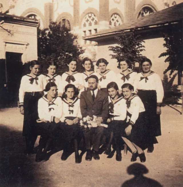 A kép hittanóra után készült, gimnazista koromban a zsidó elemi udvarán. Oda jártunk hittanórára. A háttérben látszik a zsidó templom. Matrózblúzban vagyunk, amiben a zárdisták jártak. Én az ülő sorban balról az első vagyok.