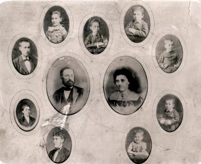 Ezen a csodálatos képen az apám, Fleischl Károly családja látható. Nekem nagyon tetszik ez a fajta kepi megjelenés. Középen vannak a szülők, Fleischl Ignác és Strasszer Karolina; és körbe mellettük a gyerekek sorban. A kép 1881-ben készült.