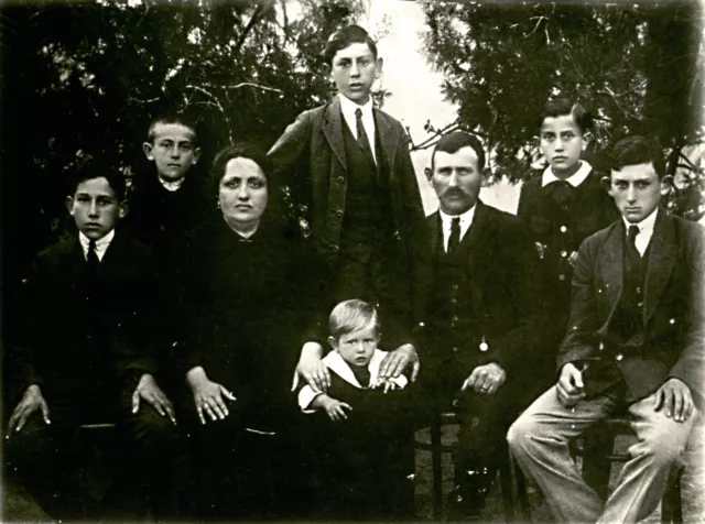 Ez a Fleischl Lipót nevű bátyja az édesanyámnak, aki a hat testvér közül az ötödik volt. És ez itt a családja. A felesége, Szerénke néni és a hat fiú. Ez Laci balra, mellette a Jóska, aztán a Sanyi. A kicsike elől az Anti, a legfiatalabb, utána jobbra a Karcsi és Béla. Ez a kép is Kiskunhalason készült, hogy mikor, azt nem tudom. A legkisebb 1919-ben született, tehát ez olyan 1921-ben készülhetett.