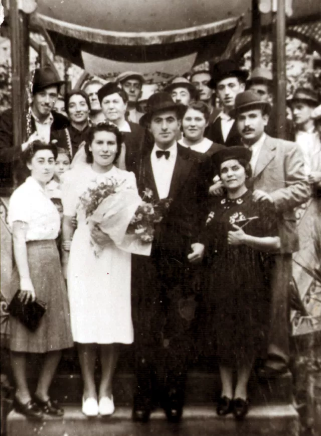 Az unokatestvéremnek, a Fogler Arankának az esküvője a hupa alatt. Tel-Avivban volt az esküvő. Aranka apja édesapám testvére, a Fogler Izidor volt. Ők Soltvadkerten laktak. Izidor órás volt, és saját műhelye volt. Ez az esküvő kb. 1943-1944-ben volt, a háború alatt, mikor ők már Izraelben [Akkor még: Palesztina. Izrael Állam 1948 májusában alakult meg. -- A szerk.] voltak. És akkor volt az esküvőjük.