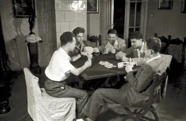A barátaimmal vagyok a lakásunkban 1952-53 körül. Balról jobbra először Bandi ül, a bátyám, aztán Kárpáti Gyuri, aki ma fogorvos és filmrendező, aztán én, mellettem Nádor Gyuri, aki Amerikában él, mellette meg Horányi Péter, aki Kárpátival együtt az osztálytársam volt. Kártyázunk. Leginkább nálunk jöttünk össze. Gyakran tettünk biciklitúrákat is a Pilisben.