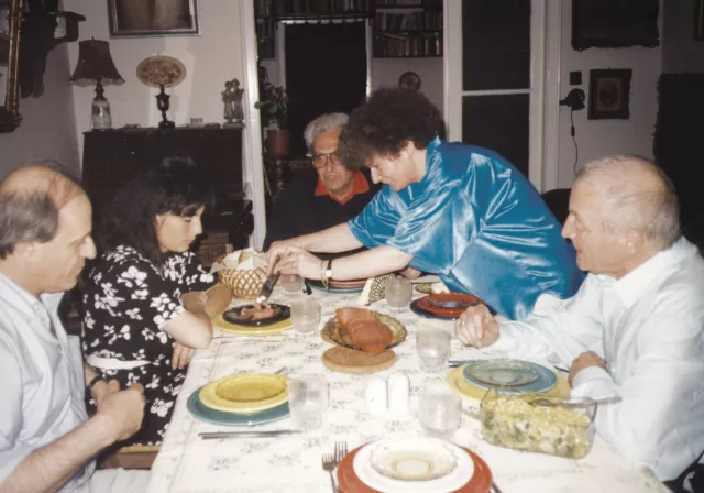 Ez a kép itthon készült 1993 májusában. A jobb oldali férfi Szabados Gyuri, aki két éve halt meg. Mérnök volt. Mellett áll a feleségem, Rédei Évi, az asztalfőn Kárpáti Gyuri ül, mellette a volt felesége, Éva és baloldalt én. A 60. születésnapomat ünnepeltük itt. A feleségem sokat gondolkodott, hogy milyen ajándékot adjon nekem, és végül azt mondtam neki: “Tudod mit, kérd meg a Kárpáti Évát, hogy fessen rólad egy képet.” Éva nagyon jól fest, főleg portrékat. És ezt a vacsorát a kép leleplezésére szerveztük.