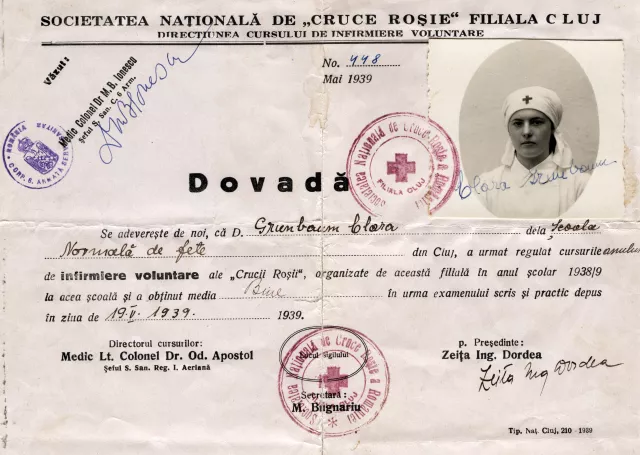 Ez a Vöröskereszttől kapott elismervényem. Kolozsvári tartózkodásom alatt elvégeztem egy vöröskeresztesnővér-tanfolyamot. Elvittek a kórházba, ahol figyelhettünk és tanulhattunk dolgokat.