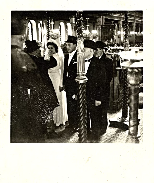 Ez az esküvői képünk, 1942-ben készült a Dohány utcai zsinagógában.