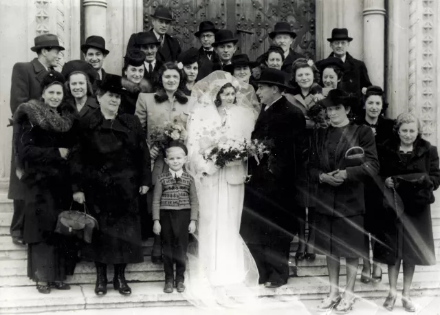 Ez a nővérem, Leimseder Margit esküvője. A nővérem középen áll, mellette jobbra a férje, Fränkel Ernő, tőle balra a második az édesanyám, Leimseder Jakabné. Az egyik bátyám, Hugó hátul áll kalapban. Az esküvő Miskolcon volt 1940-ben.