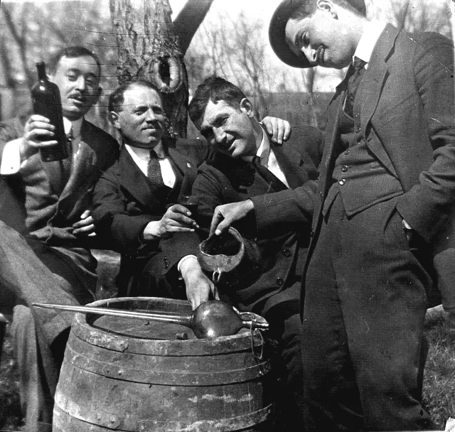 Ez még háború előtti kép, egy szüreti mulatozás alkalmával készült. Marocsán volt a társaság az egyik unokatestvér kertjében. Balról a második a férjem édesapja, mellette meg baloldalt Imre bácsi, a férjem mamájának az öccse. A többieket is ismertem, csak már nem emlékszem a nevükre. Mind rokonok, unokatestvérek.