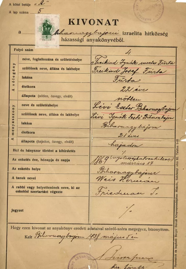 Freikind Ignác és Lévi Eszter házassági anyakönyvi kivonata